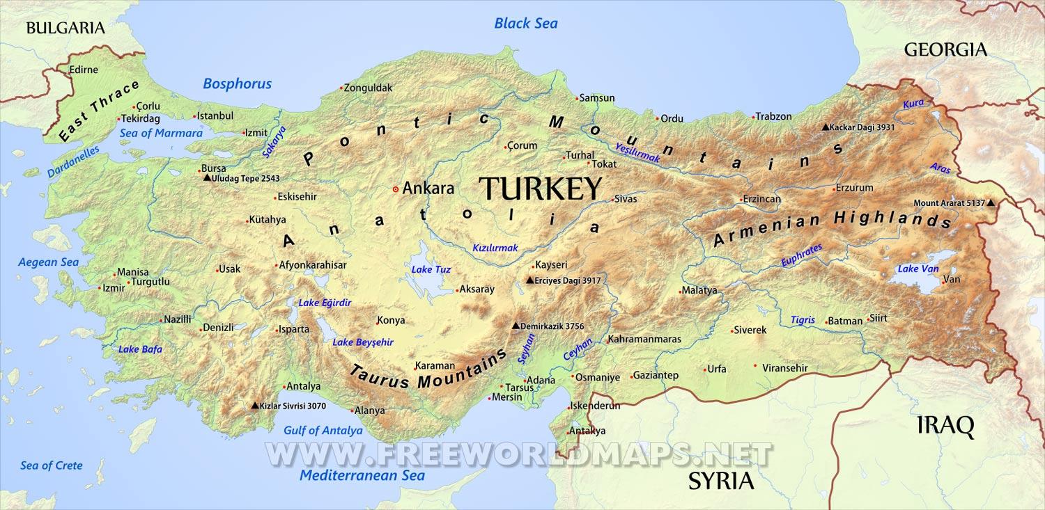 Map of Turkey mountain. Turkey mountain map (Western Asia - Asia) to print. Turkey mountain map (Western Asia - Asia) to download. Turkey is a predominantly mountainous country, and true lowland is confined to the coastal fringes. About one-fourth of the surface has an elevation above 4,000 feet (1,200 metres), and less than two-fifths lies below 1,500 feet (460 metres) as its shown in Turkey mountain map. Mountain crests exceed 7,500 feet (2,300 metres) in many places, particularly in the east, where Turkey’s highest mountain, Mount Ararat (Ağrı), reaches 16,945 feet (5,165 metres) close to the borders with Armenia and Iran. In the southeast the Uludoruk Peak reaches 15,563 feet (4,744 metres); though further west, the Demirkazık Peak (12,320 feet [3,755 metres]) and Mount Aydos (11,414 feet [3,479 metres]) are also significant peaks. Steep slopes are common throughout the country, and flat or gently sloping land makes up barely one-sixth of the total area.