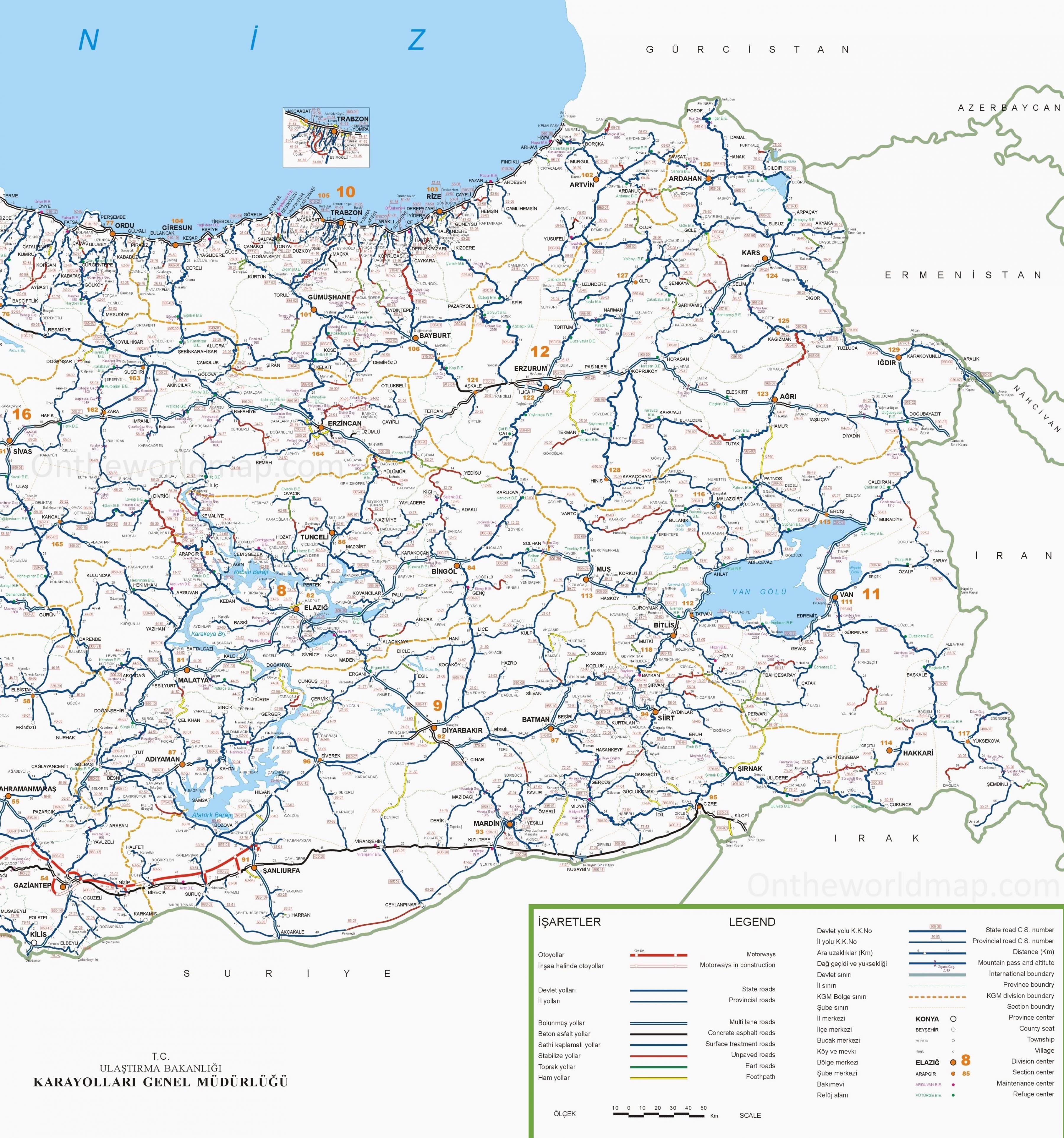 Detailed map of southern Turkey. Map of southern Turkey (Western Asia - Asia) to print. Map of southern Turkey (Western Asia - Asia) to download. Rugged landscapes, antique cities, castles and classical theatres contrast with the sun-kissed beaches and a gentle sea in this picture-postcard holiday region. The Turks call the Mediterranean ‘Akdeniz’, or white sea. Others prefer to call this land of spectacular vistas the ‘Turquoise Coast’, in honour of its translucent waters – it is indeed this colour imprint that will stay in your mind eye. Once a neglected area where a trip from Antalya to Kas was a four-day journey by donkey, the quaint fishing-village appeal of much of the Mediterranean region has largely faded. But many towns retain evidence of their Greek origins with a central village square, whitewashed houses and wooden shutters as its shown in the map of southern Turkey. Many have typical Byzantine churches with a minaret attached that turns it into a mosque.